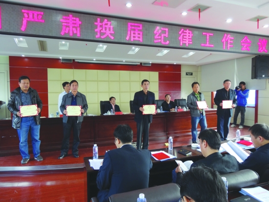 2012年10月30日,全州严肃换届纪律工作会议上,州委常委、组织部长曹普华给换届风气监督员颁发聘书。