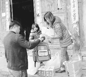 12月3日,长沙爱心人士刘钢夫妇来到保靖县清水坪镇且科村,给贫困留守儿童王玉瑶送去价值2000多元的过冬衣物、学习生活用品及1000元生活费,帮助王玉瑶平安过冬。图为爱心夫妻给王玉瑶送书包和学习用品。