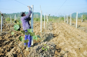 12月5日,天气晴好,永顺县松柏镇大桥村村民王林贵忙着在新垦的猕猴桃基地里搭架子。去年,该镇新增4500余亩猕猴桃,现在正是搭架子的时候,连日来,村民们抢抓天色搭架子。