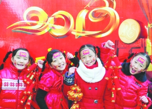 2012年12月31日,江西省九江小学的学生额头贴着蛇形节庆图案,手拿新年饰品在印有“2013”字样的展板前拍摄合影。当日,九江小学开展“快乐拼蛇年”主题活动,学生们手举中国结、灯笼、气球等,在操场上排出“2013”字样,迎接新年。 新华社发