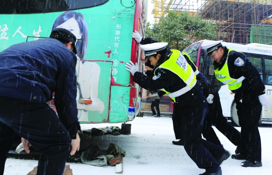 凤凰县交警对打滑车辆进行施救。 吴晓萍 摄