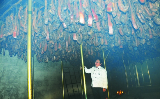 图为杨艳云在烤房里查看腊肉。 石秋云 摄