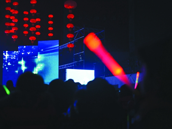 开场前,观众手中的彩棒与台上的红灯笼相呼应。