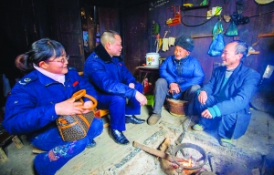 1月18日,龙山县地税局机关干部职工,顶着寒风,前往该县最偏远的洗车河镇克洞村看望慰问该局结对帮扶联系的彭官炳等10户贫困户,给每户送上了500元春节慰问金,让偏远山寨的“穷亲戚”过上一个祥和幸福的春节。图为龙山县地税局干部与克洞村民交谈。