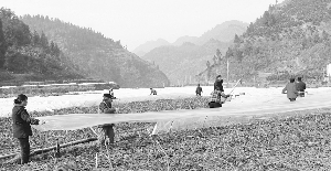 1月13日,保靖县清水坪镇客寨村的村民在忙着用薄膜盖今年扦插的茶苗。连日来,该村的茶农抢抓晴好天气,采取喷施抗冻防寒液、 盖薄膜等措施,加强冬季管理,确保茶苗不受损失。 俞采华 陈亚平 摄
