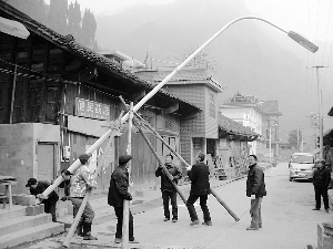 1月19日,保靖县水田河镇中心场上,八九名工人正忙着竖起路灯。从2010年湘西州启动“整脏治乱绿化行动”以来,该县高度重视“硬化、净化、亮化、绿化、美化”工程建设。截至目前,保靖已投入500多万元,完成了12个乡镇“亮化”工程,到2013年,将完成比耳、涂乍、大妥、野竹坪最后4个乡镇的亮化。这些惠民利民工程,受到了当地百姓的好评。