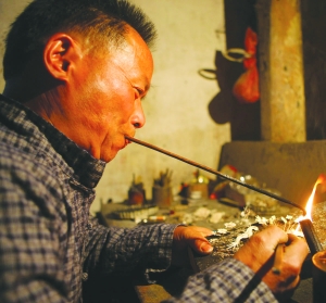 解读:一件精致的苗族银饰问世,要经过20多道工序、5万多次捶打、10万多个动作。2009年2月,北京,龙米谷现场演绎了银饰制作的过程。这位12岁拉起风箱、30岁戴上老花镜的苗族银饰制作大师,正用这别致的语言记录着苗族迁徙变迁的历史。