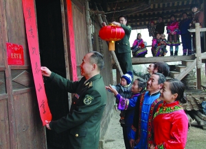 春节将至,保靖县人武部走访慰问新兵军属,组织干部为军属挂灯笼、贴春联等,送上新春的祝福。图为1月30日,该县人武部政委徐灿为土家族新兵军属彭正林家中贴春联。