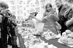 1月29日,花垣县人民医院结合当地苗族迎新年的习俗,开展了炸油粑、打糍粑等比赛活动,欢欢喜喜迎接新春的到来。图为职工们争相拍下参赛的炸油粑作品。