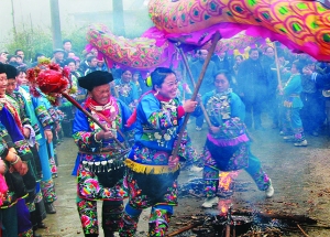 2月2日,来自贵州松桃县盘石镇,湘西花垣县吉卫镇、补抽乡等5个乡镇,两千余湘黔边区百姓在花垣县吉卫镇白岩村过“瓜冻”节(即苗年)共迎新春。图为吉卫镇腊已村群众在表演祥龙过火坑。