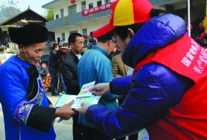 近日,保靖县电力志愿服务队来到葫芦镇开展安全用电知识宣传,确保边远山区广大群众安全用电。图为电力志愿服务队员在给苗家阿婆发放宣传资料。