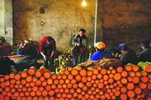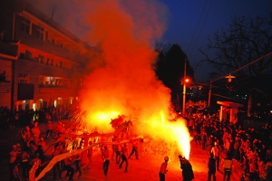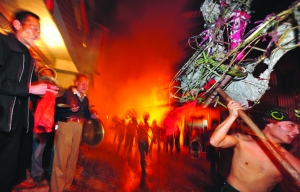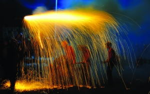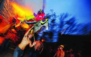 张 谨 周玮玮 李 音 彭雨昕 欧阳琴芳 易 品 锶 湘 摄影报道 火光喷射,金龙翻滚,吉首市马颈坳镇元宵烧龙送年的习俗已有300百多年的历史。每逢正月十一,舞龙人便走街串巷为乡亲拜年,祈年驱邪,称“龙拜年”,各家则燃烛、奉糖果、红包等,称“接龙”,到正月十五“正灯”日,便是“烧龙”大戏上演之时。 今年,马颈坳镇溪马社区、新湾村两个村子为正月十三、十五两天的正灯日准备了八条七彩祥龙,钢火(当地俗称:花儿)也会提早一天进入制作。社区库房里,乡民们围坐一圈“邦邦邦”地用木锤锤紧花儿,旁边一个头发斑白的老者井井有条地将木炭、硝、硫磺铲在一起,他就是出生于“烟火世家”、年近花甲的陈世斌,父辈是当年镇上唯一一家制作烟火的高手,质量好口碑佳,所以每到正月“烧龙”时,镇上的龙灯会(专为“烧龙”成立的临时组织)都会请上他做技术指导。 陈师傅回忆五六十年代的时候,家家户户都会在供销社称几两硝、硫磺,在家用生毛竹自制钢火筒。“那时候技术有限,竹筒射出的火花不亮,他父亲还发明了一种新方法,用大火将犁耙烧熔,打碎后筛成粉加入原配料中,这样配制出的钢火筒点燃后,火花亮而大!”陈师傅眉目间流露出无限的自豪感。 入夜时分,爆竹声、礼炮声、锣钹声顿起,舞龙人发出阵阵吼叫,“烧龙”大戏开始了。放花人手持长竹夹夹住竹筒,点燃后高举过龙头,先是咝咝的流泻白光,随即白光向上空冲出,下落时夹带着橘红的火星,钢火四溅,洒散着漫天花雨,舞龙人逐火而戏,哪儿的钢火猛,就冲向哪儿,沐浴其中,享受火星打落在身的痛快。 溪马社区40岁的李云江说,“烧龙”是个充满刺激性的活动,是勇敢者的游戏,喝二两烧酒可以驱寒也可壮胆,尽管如此,胆怯的人还是不敢玩儿的。李云江告诉笔者他从懂事起便开始舞龙戏龙,年年参与,自从3年前查出自己患上鼻炎癌之后,便再未能舞,只能一旁观看,手痒难耐。“医生说我这病有5年的危险期,真希望快点渡过剩下的两年时间,身体恢复之后我还要来烧一把龙!” 说话的间隙,不远处一支竹筒炸开。白光呼啸,漫起一团火云,几支竹片散落于地,吆喝声笑声从四周潮水般涌出。 这不只一场烟火盛宴,在这场火光中,没有中庸,没有柔弱,只有民族的血性,这是火的洗礼,是一种野性与阳刚,一种久违的生存状态与刚健的湘西精神。 |
