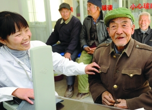 陕西省子长县余家坪乡卫生院医务人员在为当地65岁以上老人免费体检。