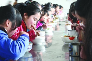 2月25日,花垣县团结中学学生在吃免费午餐。今春开学第一天,该县启动农村义务教育阶段学生“免费午餐”计划,全县29所具备供餐条件的中小学近2万名学生,每天可以在学校吃上免费的营养午餐。