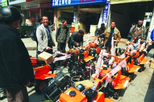 3月3日,吉首市排绸乡槐花村村民张兴元(右二)与同村6户村民一起在吉首市机电街购买农机,准备今年的春耕。农业科技化在我州农村逐步推进,今年国家有关购买农机优惠政策依然实行,但领取补贴程序有所改变。