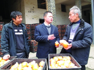 龙山县里耶镇比耳村青年农民米成东,承包了84亩园艺场,成功品改了纽荷尔脐橙、青柑等优质柑橘,销往北京、上海、沈阳等地,并带动该村群众种植优质柑橘2800多亩。去年,他投资118万元建起了比耳米氏胶筐加工厂,带动柑橘产业朝“产—供—销”一条龙方向健康发展。图为3月2日,农行里耶分理处负责人在米成东(左)的胶筐厂了解生产经营情况。