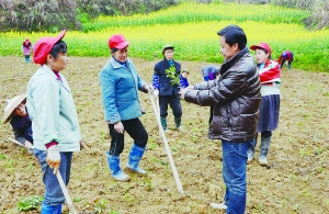 3月27日,保靖县葫芦镇农业技术服务站干部(前右一)下到排花村,在茶地里指导茶农栽植技术,提高茶苗栽植成活率。 向万银 摄