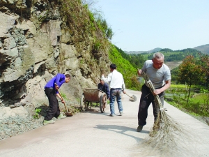 3月27日,保靖县毛沟镇科乐村杨通云(右)正在清扫通村公路上的垃圾与沙土。该村地处白云山下,交通闭塞,祖祖辈辈吃尽了不通公路的苦头。通村公路修好后,村民们爱路如爱家,经常自发清扫公路,被附近群众传为佳话。 张文华 张家智 摄