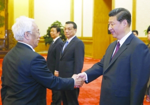 新华社北京4月3日电 (记者 钱 彤)国家主席习近平、国务院总理李克强、国家副主席李源潮3日下午在人民大会堂集体会见了180位外国驻华使节及国际组织驻华代表。 习近平、李克强、李源潮同使节和代表们逐一握手,亲切交谈,请他们转达对各国领导人及国际组织负责人的问候,感谢他们为推动中外相互了解与合作所作的努力,强调中国将始终不渝走和平发展道路,始终不渝奉行互利共赢的开放战略,愿在和平共处五项原则基础上继续全面发展同世界各国及国际组织的友好合作关系。 使节和代表们转达了各国领导人及国际组织负责人对中国领导人的亲切问候和对中国人民的良好祝愿,表示高度重视对华关系,将继续加强同中国的交往与合作。 国务委员杨洁篪等出席。 |