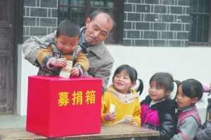 花垣县边城镇磨老小学是湘黔联办的友谊学校。4月22日上午,该校200多名师生及边区村民为雅安灾区人民捐资5000余元,传送湘黔边区人民的一份深情厚谊。图为募捐现场。 吴奕红 摄
