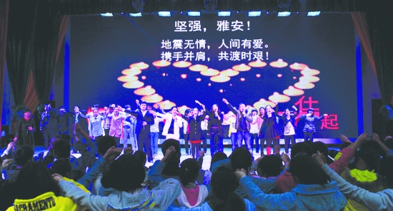 ▲ 4月23日,金曲歌手大奖赛在泸溪县辰河大剧院拉开帷幕,为表达对雅安地震灾区同胞的关怀,所有参赛歌手、工作人员和观众,手拉手合唱一曲《让世界充满爱》。地震无情,人间有爱,现场还开展了爱心募捐。 向晓菊 张克宁 摄