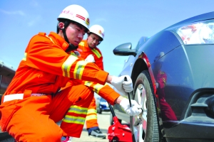4月30日,在G30连霍高速公路定西至天水段,甘肃高速公路定西清障救援大队一中队队员蔡晓鹏(前)和同事一起为故障车辆更换轮胎。 “五一”小长假期间,免费通行使得出行车流激增。甘肃省高速公路管理局所辖的各个清障救援大队均放弃了节日休息,坚守一线。定西清障救援大队一中队“85后”队员蔡晓鹏和队友全天候巡查在辖区内130公里的高速路上,确保过往车辆平安