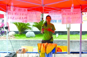 不愿留名的聋哑志愿者,36岁,理发师,4月23日从江苏昆山赶至灾区,每天义务理发100余人。他给记者写道,虽然我生活在无声世界里,但我有眼可以看,有手可以做,希望能为灾区贡献一点力量。 4月29日是“五一”小长假的第一天,记者在四川省芦山地震灾区看到来自四面八方的劳动者坚守一线,为灾区早日恢复正常而努力。 新华社记者 金良快 摄