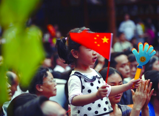 决赛现场,一名小歌迷为心中的偶像摇旗呐喊。