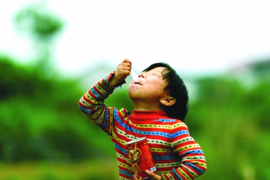 小合玉一脸幸福地吃着“园长妈妈”带给她的八宝粥,在小合玉的世界里,八宝粥是最好吃的东西。