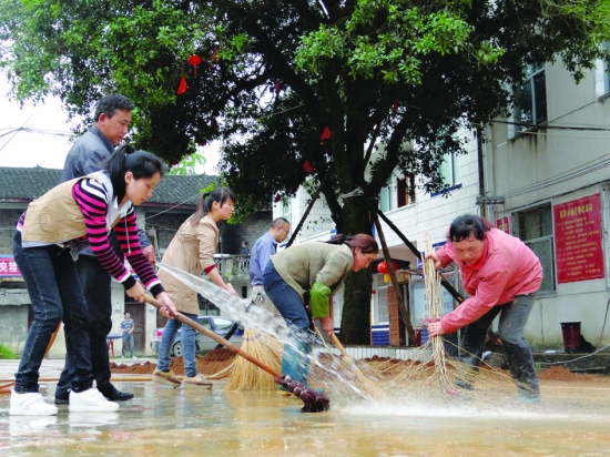 近年来,永顺县高坪乡加大生态建设力度,全乡森林面积达152000亩,森林覆盖率达78%。图为5月6日,高坪乡政府干部在给政府院内百年桂花树填土、剪枝、施肥后清扫垃圾。 唐其柏 罗远程 摄