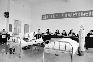 为迎接“5·12”国际护士节的到来,近日,泸溪县举行优秀护士技能操作竞赛,来自全县各医疗卫生单位的23名优秀护士参加了这次竞赛。图为县人民医院护士正在进行徒手心肺复苏操作。
