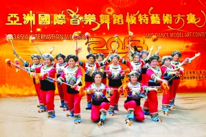 前不久,泸溪县潭溪镇潭溪社区妇女歌舞队赴香港参加亚洲国际音乐舞蹈模特艺术大赛,演出“九子鞭”等民族节目,荣获此届大赛集体金杯、银杯奖,其中15个参赛队员获得个人银牌奖。图为该队在香港比赛现场。