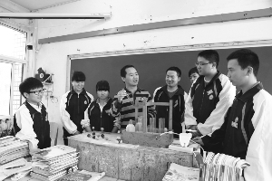 州民中化学老师吴国锋(左四)在指导学生做化学实验。