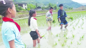 眼下正是插秧季节,5月21日,保靖县水田河小学五(1班)的小学生们,在学校附近的农田里向苗家阿婆学插秧。近日,该校适当安排课余时间,让学生参与社会实践,感受粮食来之不易。