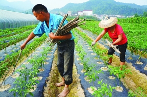 5月24日,永顺县吊井乡吊井村,彭武明夫妇在给辣椒树插枝固身,以防植株倒伏 ,避免强风暴雨带来的损失。近年来,该乡党委、政府大力扶持菜农采用遮强光、降温、保湿、保肥和防暴雨的地膜种植技术,做大做强夏秋反季节蔬菜。并随时派出农业技术员,深入田间地头,随时留意气象动态,提前通知菜农做好防范抗灾准备工作,降低了因自然灾害带来的损失,蔬菜产业成了该乡富民强村的支柱产业。 吴 华 摄
