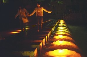 古城内一排排仿古的路灯、楼阁旁一盏盏大红的灯笼、跳岩边一串串温馨的地灯……从2005年开始的夜景亮化工程给乾州古城的夜晚带来了引人注目的变化。图为游客从跳岩上走过。