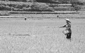6月11日,吉首市社塘坡乡坪云村一农民正在给秧苗施肥。 端午前后,我州乡村刚刚移栽不久的秧苗长势良好,农民们忙碌在田间,为秧苗施肥、杀虫以及拔草等田间培管,打好稻谷生产丰收的基础仗。 本报记者 石秋云 摄