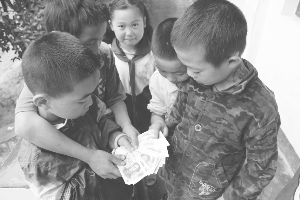 6月7日,保靖马王小学学生在同伴面前展示用钱买来的伍拾元和壹佰元“儿童钱币”。近日,有些学校门口的小商店,非法出售一种“儿童钱币”假纸钱,这种假纸币仿造1980年、1990年及1999年等版本的人民币印制,版面与真币看起来一样。许多小学生买一沓沓假纸钱来比谁的钱多,严重影响孩子们的健康成长。 俞采华 摄
