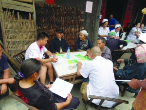 为贯彻落实关于改进工作作风,密切联系群众的相关规定,从6月份起,花垣县卫生局从麻栗场镇、排碧乡等10多所乡镇卫生院,抽调医护人员,开展“百名医生下基层、送医送药送健康”义诊活动。截至6月13日,先后在吉卫镇夯来村和排料乡金龙村开展义诊活动。为1153位村民进行健康体检并建立和完善健康档案,赠送价值16958元的各类药品,免除各类检查费用24570元,发送健康知识宣传手册1100多本。图为金龙村义诊活动现场。