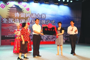 6月18日上午,泸溪县委、县政府在县文广新局电视演播厅举行仪式,庆祝该县荣获国家级“诗词之乡”称号。图为中华诗词学会副会长宣奉华(左一)和省诗词协会第一副会长彭崇谷(右一),为泸溪县授全国“诗词之乡”牌匾。