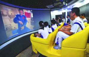 6月20日,在南开中学航天体验馆,学生们通过弧形屏幕观看中国首次太空授课。