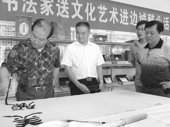 近年来,州书法家协会为繁荣文化事业,发展文化产业,坚持走群众路线,组织州内书法名家送文化艺术进机关,进企业,进学校,进社区,进军营。6月29日,州书法家协会组织州内书法名家来到边城醋业有限公司,实地创作了多幅贴近实际、贴近生活、贴近群众的书法作品。图为州书法家协会杨刚正在即兴挥毫。 岳跃强 摄