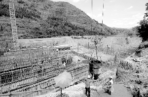 7月11日,花垣县竹篙滩桐木寨二电站建设工地,施工人员顶着烈日在紧张施工。该项目总投资1.07亿元,总装机容量1万千瓦,计划明年建成投产。