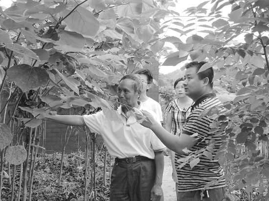 今年,永顺县推行党代表联系产业制度,切实为联系对象排忧解难促发展,深受群众欢迎。图为7月11日,该县党代表向进(右一)在西米村花卉苗木基地查看巨紫荆长势情况。 唐其柏 姚 婷 摄