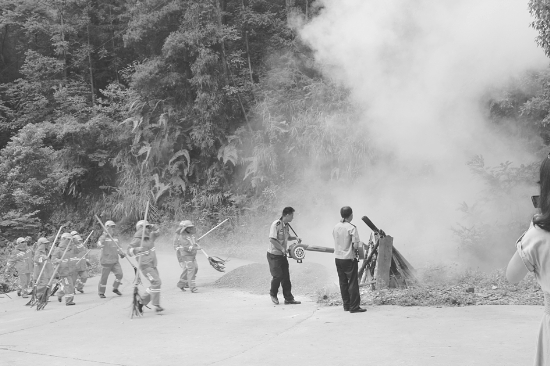 ▲7月10日,泸溪县森林公安局牵头,联合军亭界林场、林业局等单位,在天桥山自然保护区开展森林防火实战演练。共出动车次7台(次)、专业扑火队员20余人,使用风力灭火机2台、手投式森林干粉灭火器8枚、打火棍20把,为迅速扑灭山火取得宝贵经验。图为森林防火现场。 向民贵 李 潇 摄