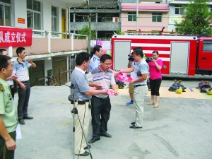 7月18日,吉首市矮寨镇和丹青镇相关负责人从吉首市政府相关领导手中接过消防车钥匙。