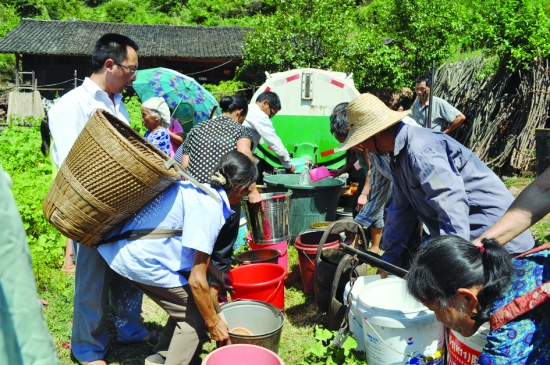 8月11日,古丈县交通运输局40余名干部职工,深入山枣乡磨刀村、火麻村,为村民送50桶纯净水、2000米引水管,并安排送水车为村民定期送水。图为村民在分水。 本报特约记者 石立新 通讯员 胡溶花 摄