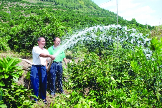 8月6日,龙山县里耶镇比耳村脐橙种植大户石宗林,从酉水抽水浇脐橙,确保脐橙产业不受旱灾影响。 本报记者 唐 庆 通讯员 付 军 摄