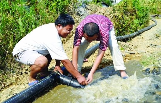 8月2日,泸溪县兴隆场镇副镇长谭志勇(右)与烂泥田村村支书邓永国(左)在接引水管灌溉农田。 本报记者 周玮玮 摄