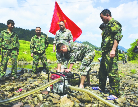八月八日,永顺县民兵抗旱应急分队在颗砂乡新寨村帮助村民抽水抗旱。 向水生 罗寿冈 摄